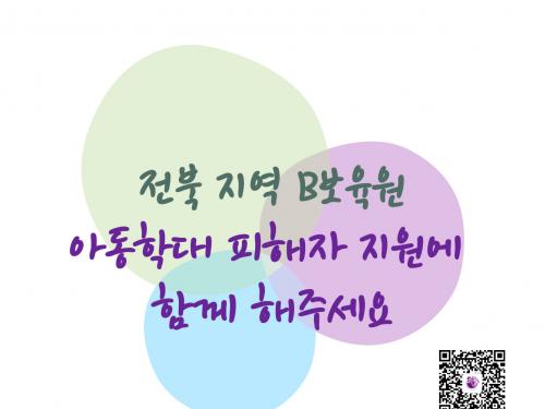 - [전북 지역 B보육원 아동학대 및 인권 침해사건 비상대책위원회] ❝전북 지역 B보육원 아동학대 피해자 지원에 함께 해주세요❞ 고아권익연대, 장애와인권발바닥행동, 정치하는엄마들, 공익 변호사들이 함께 힘을 모아 '전북 지역 B보육원 아동학대 및 인권침해 사건 비상대책위원회'를 꾸렸습니다. 아동학대 피해자분들에게 필요한 법률 지원과 심리치료를 지원하고 있습니다. 세상을 향해 낸 어려운 외침이 외면받지 않도록, 꼭 필요한 지원이 멈추지 않고 이어질 수 있도록 든든한 응원을 전해주세요. 🙌 후원으로 함께 하기 https://box.donus.org/box/politicalmamas/children_right 🧩자세한 이야기