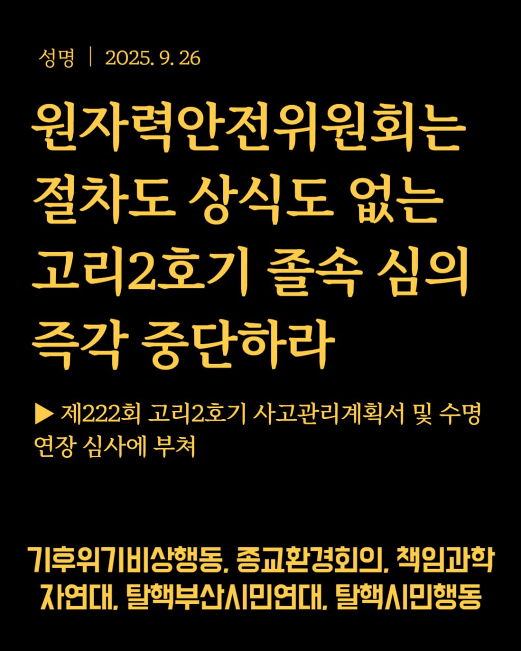 이는 단지 상징적 저항이 아니다. 이들은 40년 넘는 세월을 세계 최고 핵발전소 밀집지역에서 살아온 핵발전소 주변의 진짜 주인들이며, 이들의 생존권이 걸린 문제 앞에서 원안위의 졸속 심의와 비민주적 절차를 결코 좌시하지 않을 것이다. 원안위는 절차도 상식도 없는 고리2호기 졸속 심의를 즉각 중단하라.