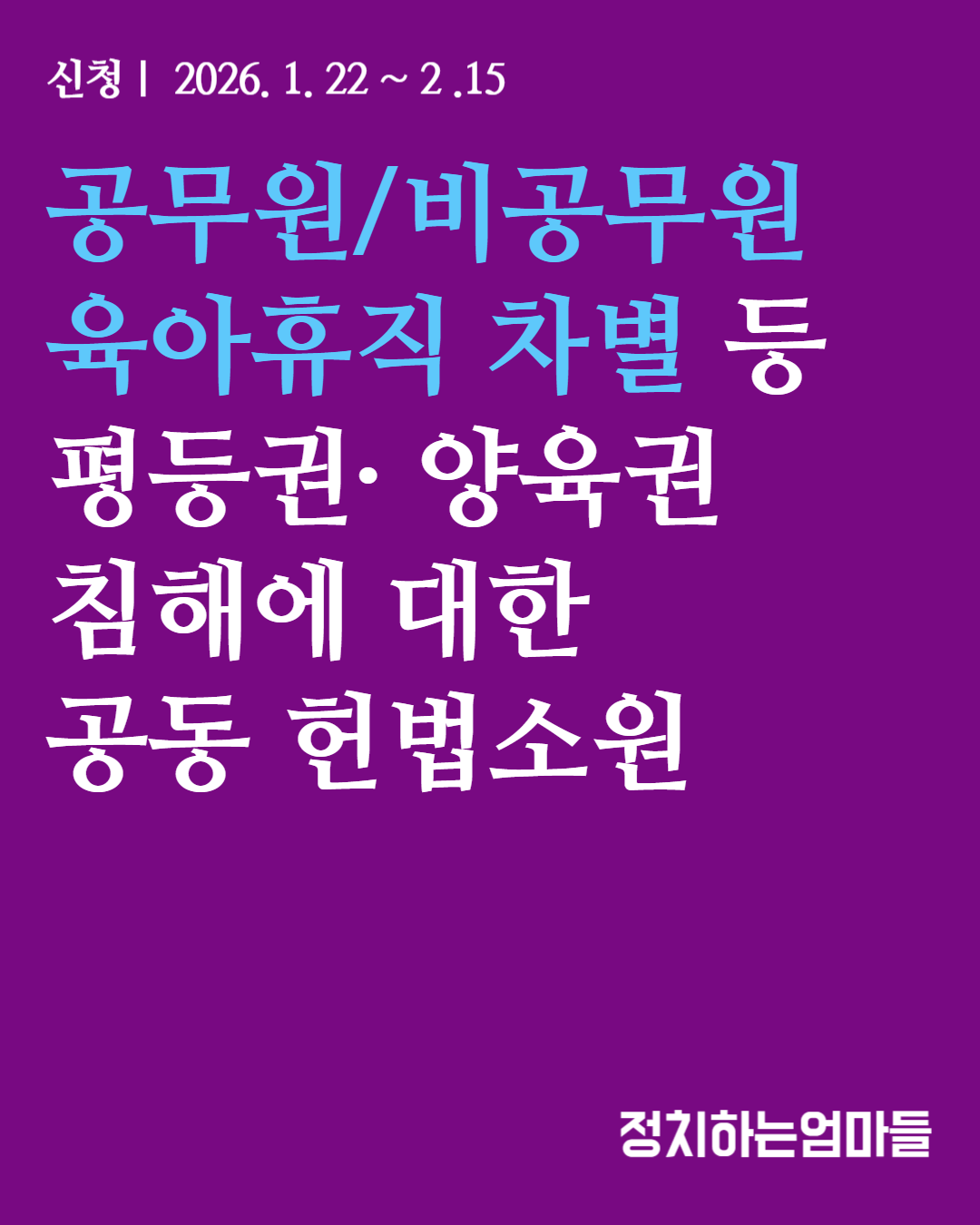이에 정치하는엄마들은 2월 15일(일)까지 공무원/비공무원 육아휴직 차별 등 평등권 · 양육권 침해에 대한 헌법소원 공동청구인을 모집합니다.