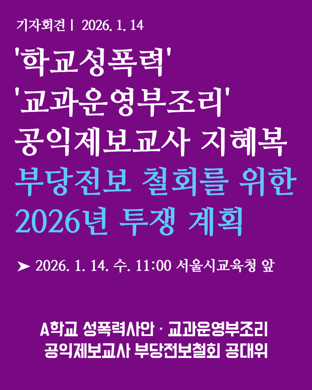 2026년, 지혜복 교사와 A학교 공대위는 서울시교육청 정근식 교육감의 행정폭력에 맞선 투쟁을 더욱 확대할 것입니다. 이에 1월 14일(수) 11시 서울시교육청 앞에서 2026년 입장을 발표 기자회견을 열 예정이니 많은 언론인들의 취재와 보도 요청 드립니다.