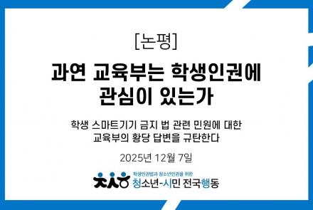 [학생인권법과 청소년인권을 위한 청소년-시민전국행동 |논평] 과연 교육부는 학생인권에 관심이 있는가 - 학생 스마트기기 금지 법 관련 민원에 대한 교육부의 황당 답변을 규탄한다
