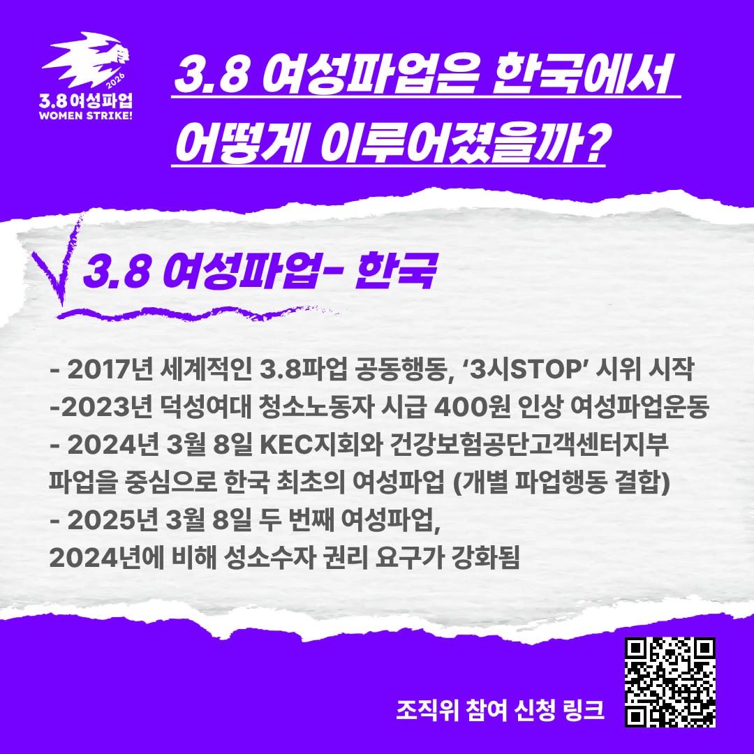 학교와 가정, 일터 등 권력 관계가 작동하는 공간에서 개개인이 겪는 특수한 문제가 아니라 각각의 구조적 특성이라는 것이 드러났습니다. 개인의 삶에서 벌어지는 일은 사회적 권력 구조와 연결되어 있으며, 따라서 변화는 정치적 행동을 통해 가능합니다. 하여 우리는 정치적 행동을 통해 우리 삶을 바꾸기 위해서 여성 파업에 나섭니다. 개인적 경험으로 가두지 않고 사회의 구조적 변화를 만들기 위해 일손을 멈추고 38 여성 파업에 나섭니다. 3.8 여성파업을 통해 우리 존재의 사회적 역할을 드러내고 우리의 정치적 힘을 보여줄 것입니다. 역사 속에서 여성은 가부장제와 지배 계급에 강요한 차별과 불평등에 저항해 왔습니다.