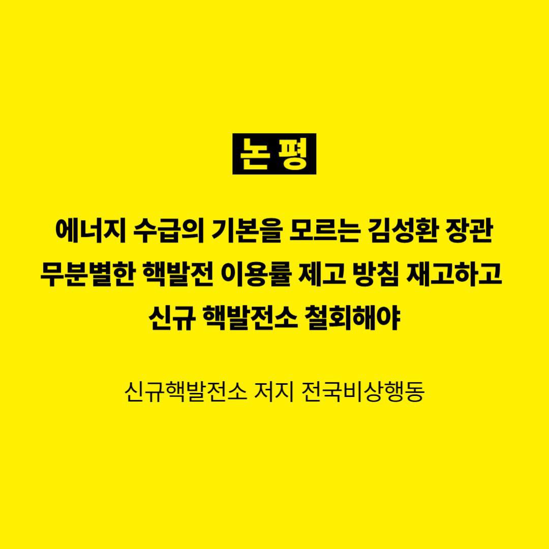 ![[논평 | 신규핵발전소 저지 전국비상행동] 에너지 수급의 기본을 모르는 김성환 장관 무분별한 핵발전 이용률 제고 방침 재고하고 신규 핵발전소 철회해야](https://dundfzenyoyeexdkarpp.supabase.co/storage/v1/object/public/media/uploads/2026/03/image-1773304743220.jpeg)