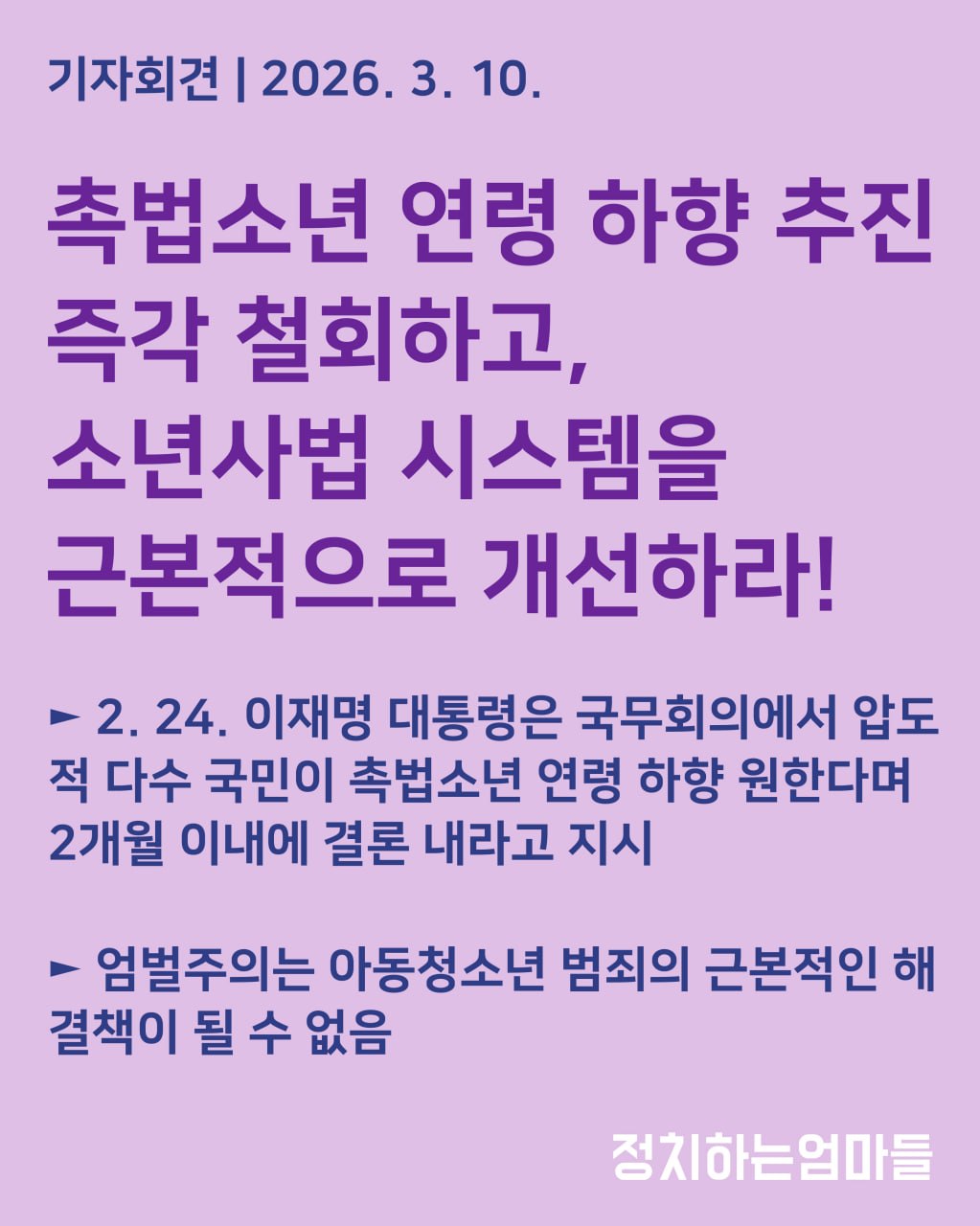 ![[보도자료] 촉법소년 연령 하향 반대 기자회견 "촉법소년 연령 하향 추진 즉각 철회하고, 소년사법 시스템을 근본적으로 개선하라!"](https://dundfzenyoyeexdkarpp.supabase.co/storage/v1/object/public/media/uploads/2026/03/image-1773218976291.jpeg)
