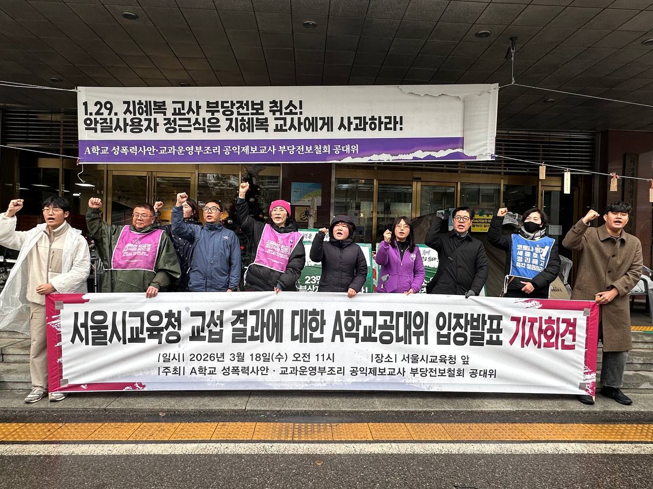 ![[보도자료] "정근식 교육감은 지혜복 교사 해임을 즉각 취소하고 복직을 확약하라" 서울시교육청 교섭 결과에 대한 A학교공대위 입장발표 기자회견](https://dundfzenyoyeexdkarpp.supabase.co/storage/v1/object/public/media/uploads/2026/03/image-1773823718828.jpeg)