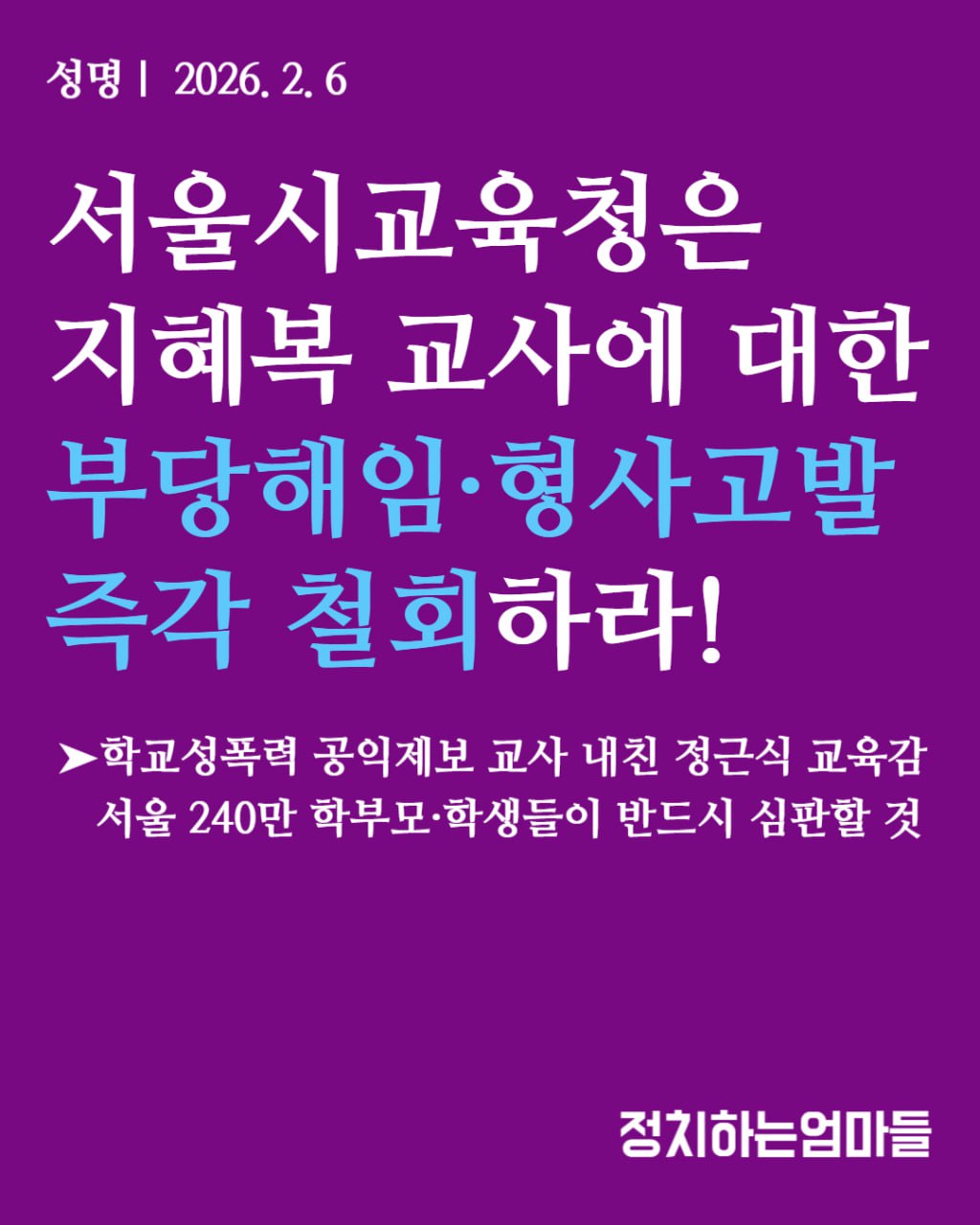 ![[성명서] 서울시교육청은 지혜복 교사에 대한 부당해임·형사고발 즉각 철회하라! 학교성폭력 공익제보 교사 내친 정근식 교육감, 서울 240만 학부모와 학생들이 반드시 심판할 것](/images/logo-placeholder.png)