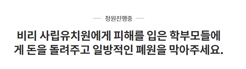 ‘비리 사립유치원에게 피해를 입은 학부모들에게 돈을 돌려주고 일방적인 폐원을 막아주세요.'
