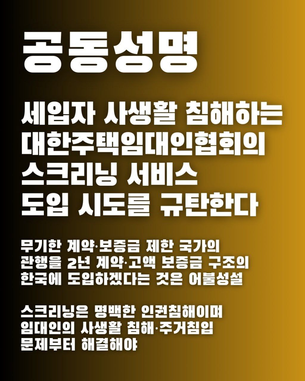 [공동성명] 세입자 사생활 침해하는 대한주택임대인협회의 스크리닝 서비스 도입 시도를 규탄한다