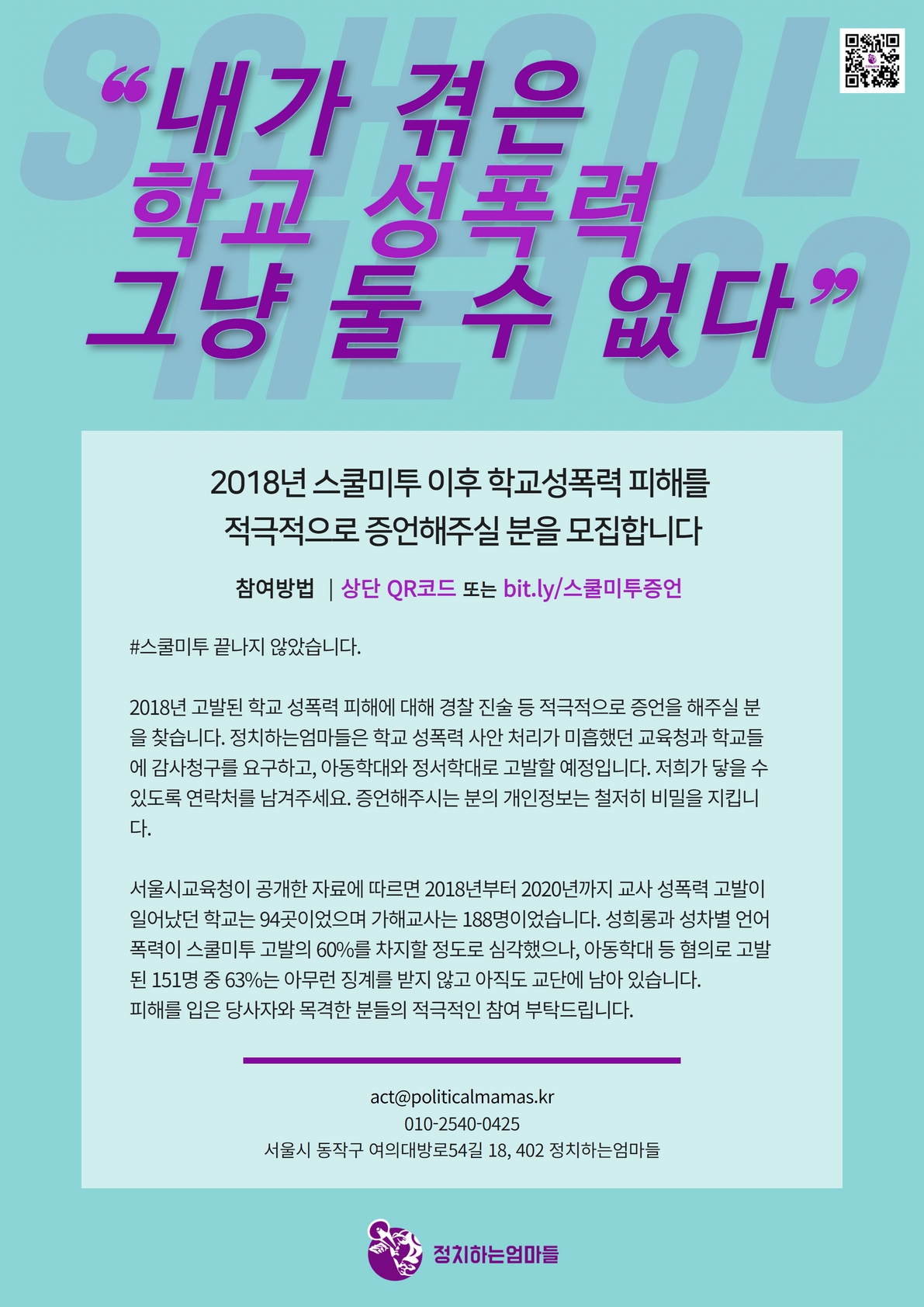 스쿨미투팀 참가신청과 활동에 대한 문의는 정치하는엄마들 사무국으로 보내주세요.